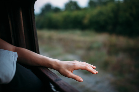 Homeless immigrant climbing on freight train, close up of hand, conceptual image with selective focus