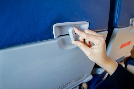 Male person seat in airplane and squeezes chair, scared to fly in sky. Aerophobia and fear of flying on aircraft