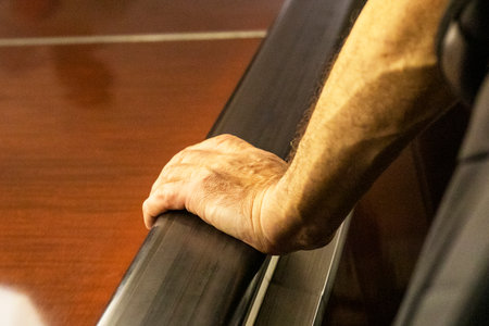 The lonely older hand of a man. An older man sitting on a bench, bokeh background, outdoors