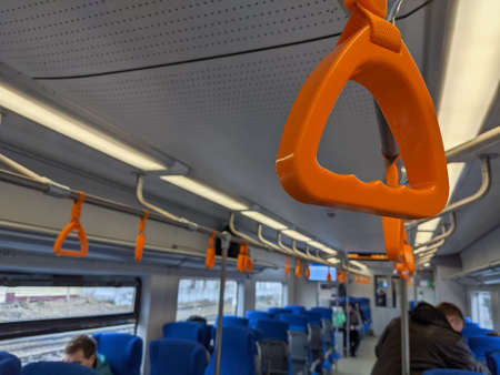 Moscow, Russia - 03 12 2020: An almost empty urban / suburban train usually full to capacity with commuters and other passengers is one of the sign of social distancing because of covid-19