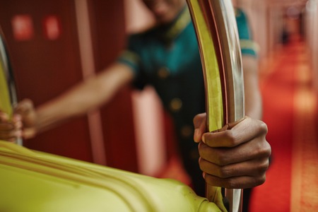Closeup portrait of African-American bellhop pushing luggage cart delivering bags to hotel rooms in hallway, helping guests