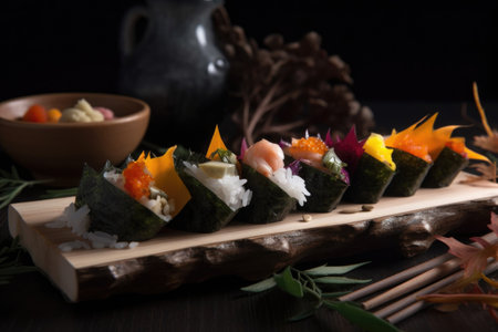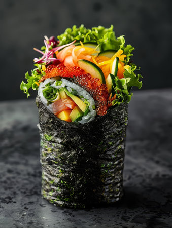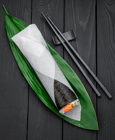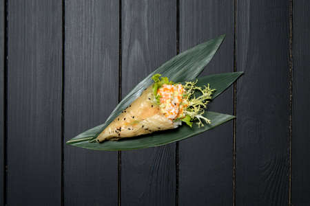 Japanese Sushi Temaki with tiger shrimp, rice, flying fish roe (Tobiko), avocado and salad mix in Mamenori seaweed on bamboo leaves. Close up of Pan Asian traditional dish on dark wooden board