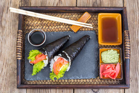 Salmon temaki sushi cone on the tray. Studio Photo