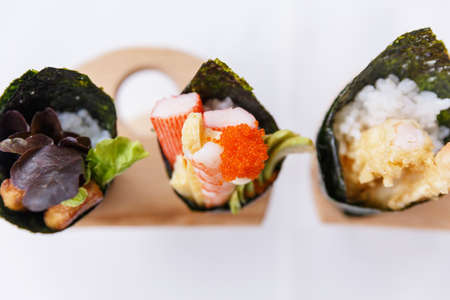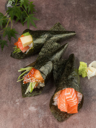 Hand-rolled temaki sushi traditional Japanese cuisine. Selective focus
