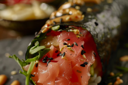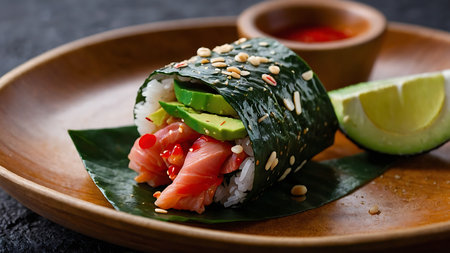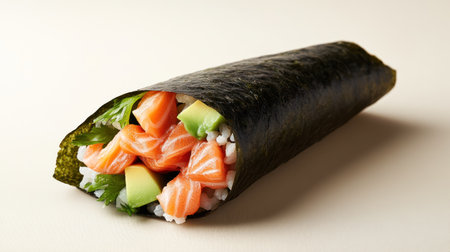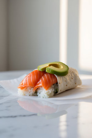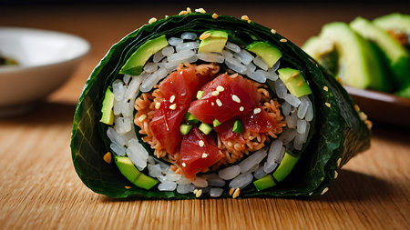 AI Generated. Sushi burrito with salmon and avocado closeup