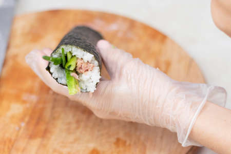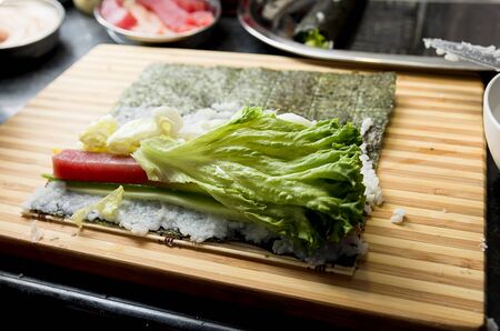 prepare and make homemade sushi on the table at home
