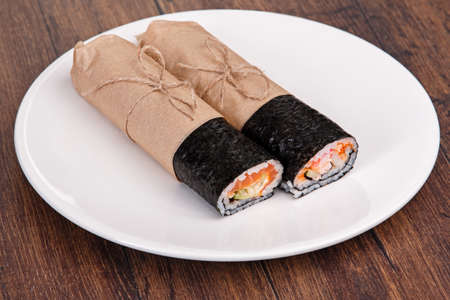 Sushi burrito - new trendy food concept. Sushi burrito rolls on the plate