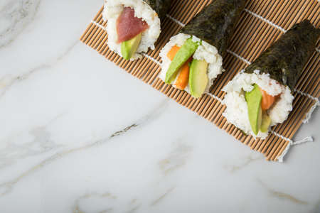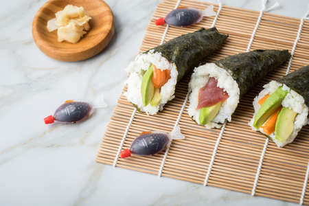 Salmon, tuna fish and Surimi avocado Temaki sushi in row on mat and marble background