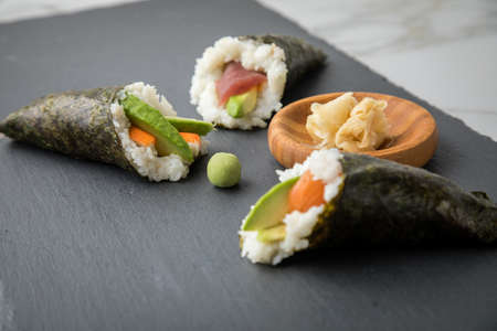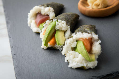 Salmon, tuna fish and Surimi avocado Temaki sushi with pickled ginger and wasabi on slate plate and marble background