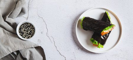 Vegetarian paleo diet nori wraps with tuna, cucumber, sweet pepper and microgreen radish sprouts.