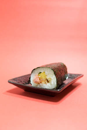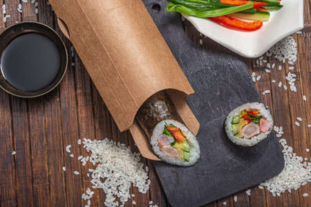 Still life. Japanese cuisine- roll in a package. Flat lay