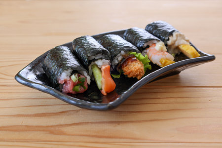 Sushi on a black plate on a wooden table, Japanese food