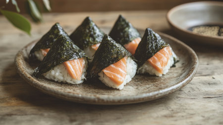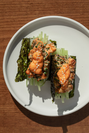 A beautiful plate of sushi delicacies featuring salmon and seaweed, perfect for showcasing Japanese cuisine. Ideal for food photography and culinary creations.