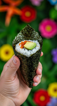Close-up view of a hand holding a cone-shaped sushi roll. The roll is filled with avocado and seafood. It is wrapped in nori seaweed. Vibrant flowers and foliage are visible in the background, creating a colorful backdrop. The lighting is bright and well-focused on the roll. Suitable for use in commercial contexts, such as food magazines or advertisements, or for editorial use related to healthy or Asian cuisine.