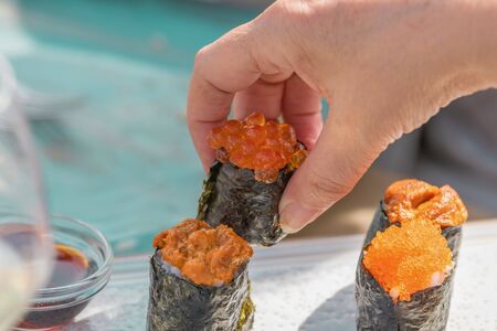 Japanese hand rolls with unagi and sauce