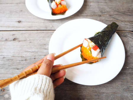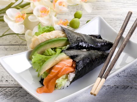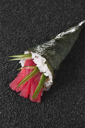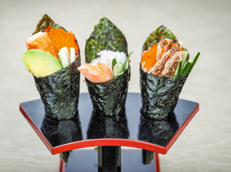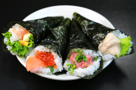 Hand rolled temaki sushi traditional japanese cuisine