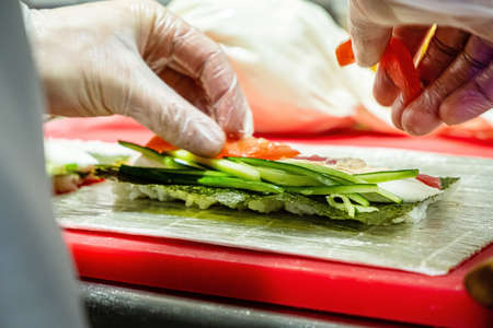Chef hands cooking sushi with rice, salmon and nori on kitchen of japanese restaurant