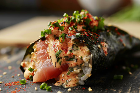 Japanese handroll temaki with fish and rice