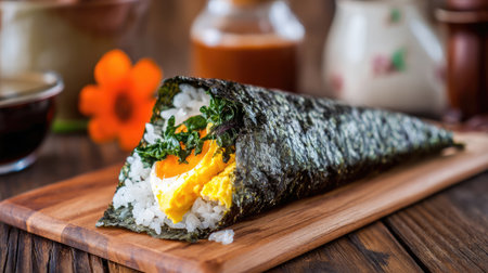 Experience a mouthwatering sushi roll filled with fresh vegetables and egg, beautifully presented on a wooden board, ideal for food enthusiasts.