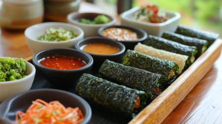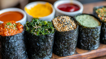 A close-up of crispy seaweed rolls served with a variety of colorful dipping sauces, highlighting the deliciousness and appeal of this beloved snack.