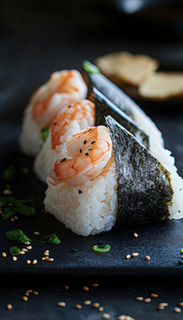 Sushi with shrimps and sesame seeds on a black background