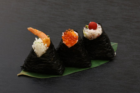 Rice balls with various ingredients such as pickled plums, salmon roe, and prawn tempura