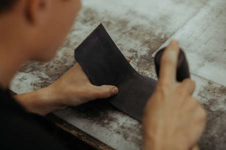 Close up of leather craftsman working with natural leather. Handmade master at work in local workshop. Handmade concept.