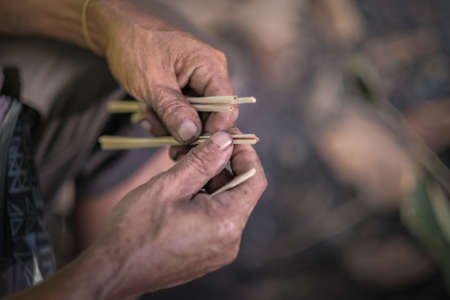 close up old woman's hands making a wicker basket.