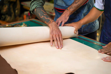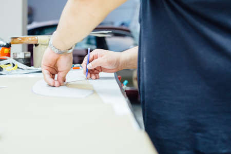 Cropped view of the hands of a male worker preparing the design of the leather in the work table to upholstering the interior car components in a leather upholstery factory