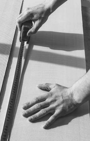 a man makes a marking tape on a sheet of sound proof and heat insulating material, black and white photo