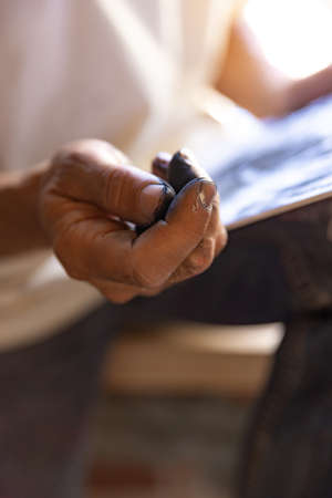 Close up of artists hand painting with graphite crayon