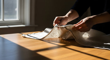 Hands carefully folding or arranging a light-colored linen cloth with floral embroidery on a wooden table. Sunlight streams in from the side, highlighting the texture of the fabric and creating a warm, domestic atmosphere of preparation.