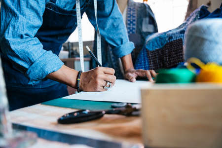 Cropped image of pattern paper on the table while the man in blue shirt draw the design of clothing.