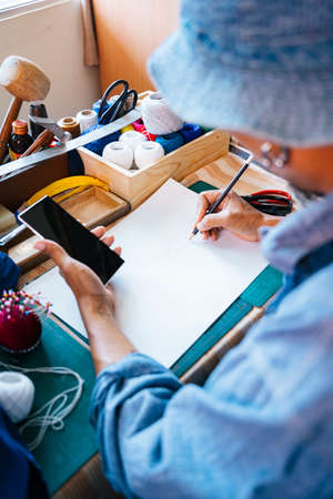 A man in blue clothes, hat and apron draw the pattern of his clothes on the paper with pencil and look at the reference on the internet by smartphone.