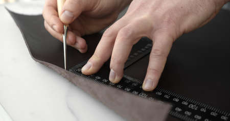 The tailor draws a sketch on leather material with a pencil and a ruler close up.
