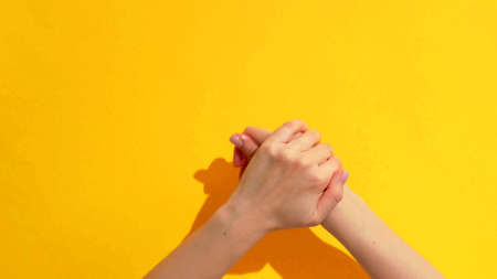 Close-up of female hands on the right side on a black background. Hand care concept, clean hands, hand cream