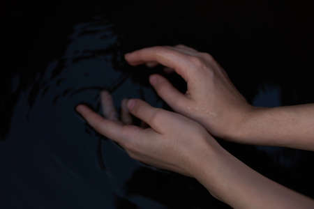 Praying hands to God in the dark. Woman hands reaching out to God or for help in barokko style