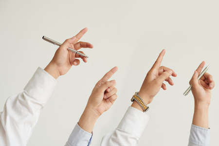 Group of people reaching up together. Hands of young and mature men and women after high five, white background, cropped shot, bottom view close up, square format. Community, team, teamwork concept