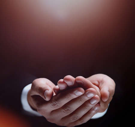 Male weary hands, palms up on a black isolated background. Concept of Hope and Support.
