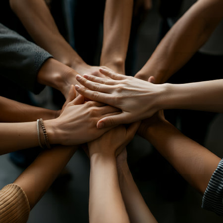 Diverse hands symbolizing teamwork, empathy, partnership, and social connection in business