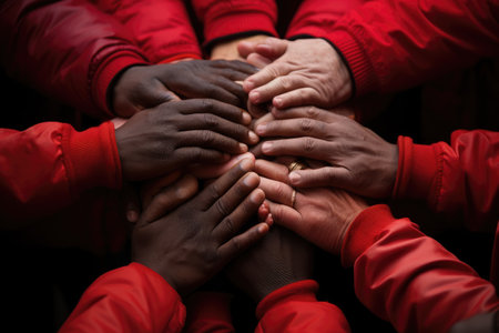 Close-up image captures a collection of hands clasped together, showcasing a range of skin tones. The composition emphasizes textures and colors of various sleeves and hands. Soft lighting creates a warm atmosphere. Suitable for use in projects related to teamwork, collaboration, or inclusivity, as well as editorial purposes.