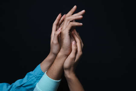 Praying hands top view. Prayer to god with faith and hope young hand on black background