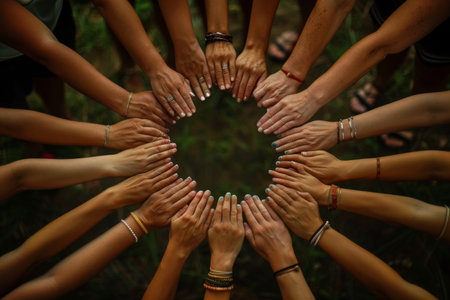 This captivating image showcases a harmonious arrangement of hands in various skin tones, forming a circle that represents togetherness and support. The hands, each unique yet collectively powerful, evoke a sense of community and shared purpose, inviting viewers to reflect on the strength found in diversity