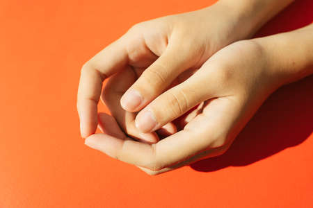 Women's hands. Neon blue-red light. Mystical light, Halloween theme. Retro wave 80s