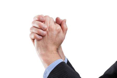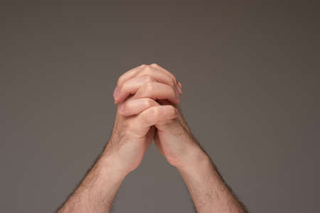 Caucasian male praying hands. Close up studio shot, isolated on brown background.