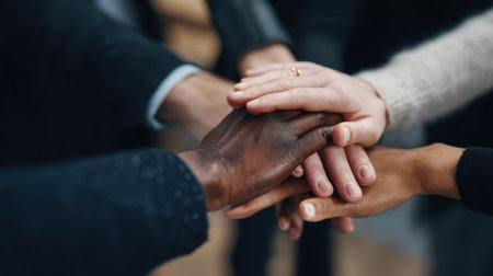 Diverse hands are stacking on top of each other, symbolizing unity, solidarity, support, and cooperation among different people working together as a team