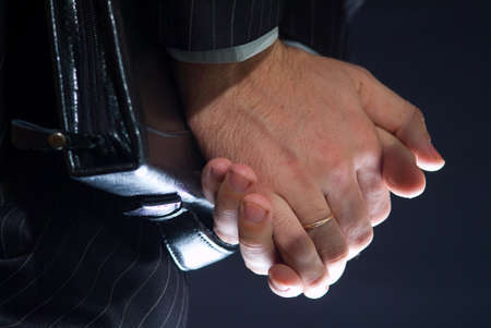 Woman put her hands together, fingers intertwined. Fingers clasped