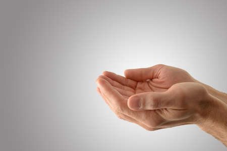 Hands with palms up of a religious man with offer gesture with isolated gray background. Sideview.