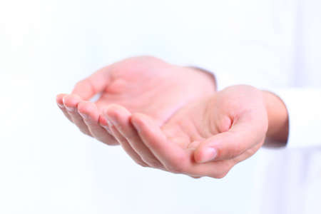 I stand before you with hands wide open. Closeup of an unrecognizable person reaching out with their open hands against a blue background.