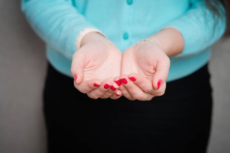 closeup of young woman hands. hands outstretched in cupped shape. selective focus.